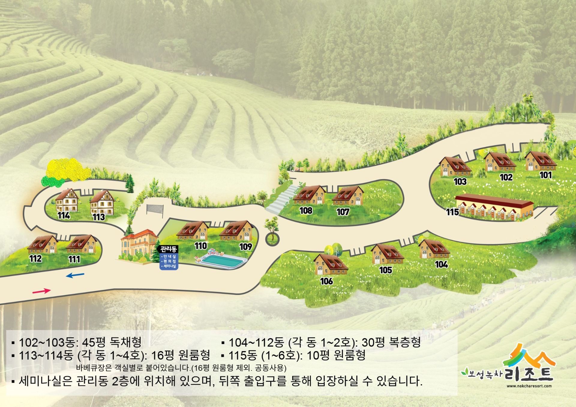 보성 녹차 리조트는 보성 한국차, 소리문화공원 내에 위치해 있으며, 국내 유일한 호텔식 통나무집 시설입니다.